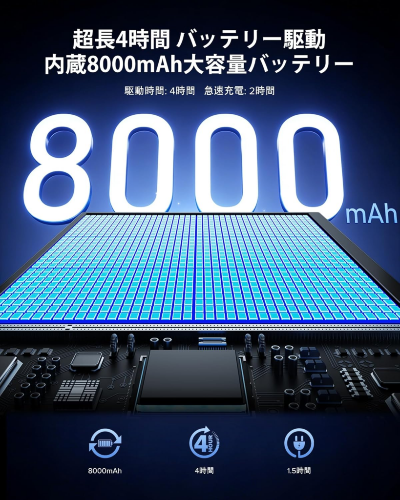 - バッテリー容量: 8000mAh(駆動時間:約4時間)