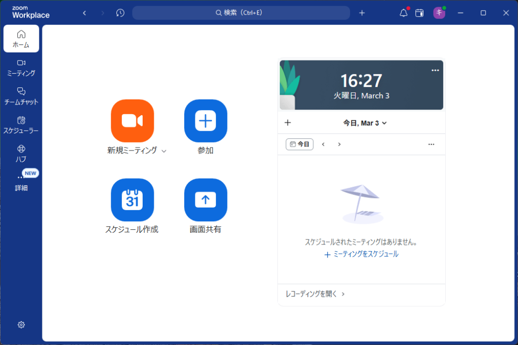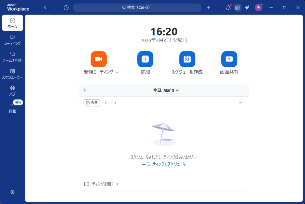 ウィンドウの幅を少し狭くすると、AI Companionは非表示になります。が、「新規ミーティング」、「参加」、「スケジュール作成」、「画面共有」のアイコンは横並びのままです。