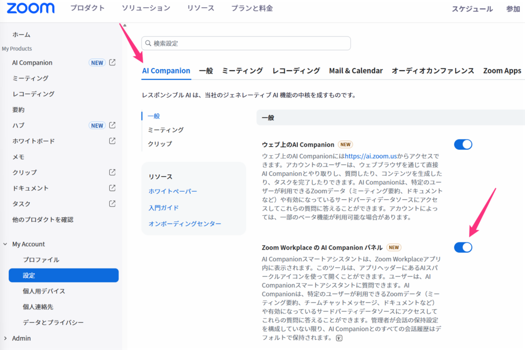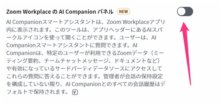 ZoomのWEBポータルにアクセスし、「設定」からAI Companion タブの「Zoom Workplace の AI Companionパネル」のスイッチをオフにします。